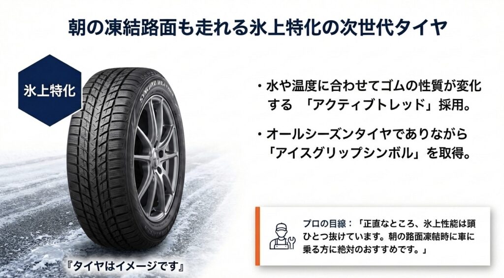 他にアイスバーンを走れるオールシーズンタイヤは無いって聞いたわ。