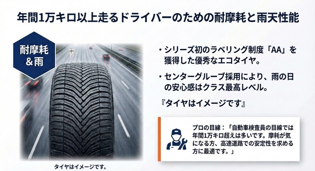 高速走行が多いなら、直進安定性が高く「a」ランクのウェットグリップを持つクロスクライメート3や新車同等の性能であるマルチウェザーが安心です。