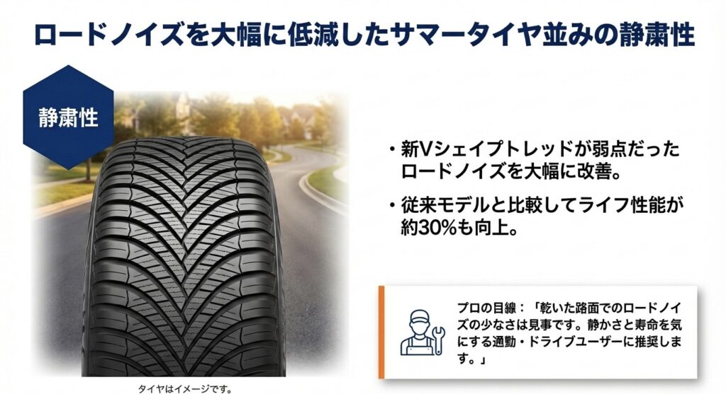ベクターGEN3は、新Vシェイプトレッドにより、弱点だったロードノイズを大幅に低減し、サマータイヤ並みの静かさを実現しました。