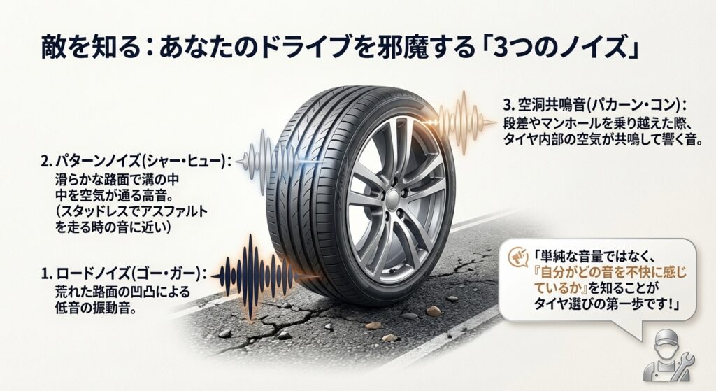 タイヤの静かさを比較する際、単純な音量だけでなく「どの音が気になるか」が重要です!