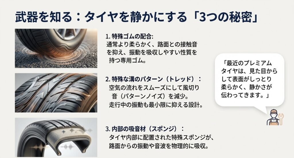 最近の静かなタイヤでは、タイヤ内部に吸音材を使用する技術が進化しています。
