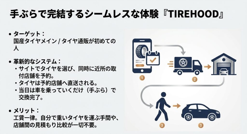 タイヤフッドは、ネット価格のタイヤを購入できて、そのまま近所の工場に予約まで出来ちゃうって聞いたわ!