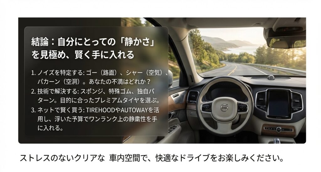 静かなタイヤを選ぶことで、車内の静粛性が高まり、会話や音楽がよりクリアに楽しめます。
